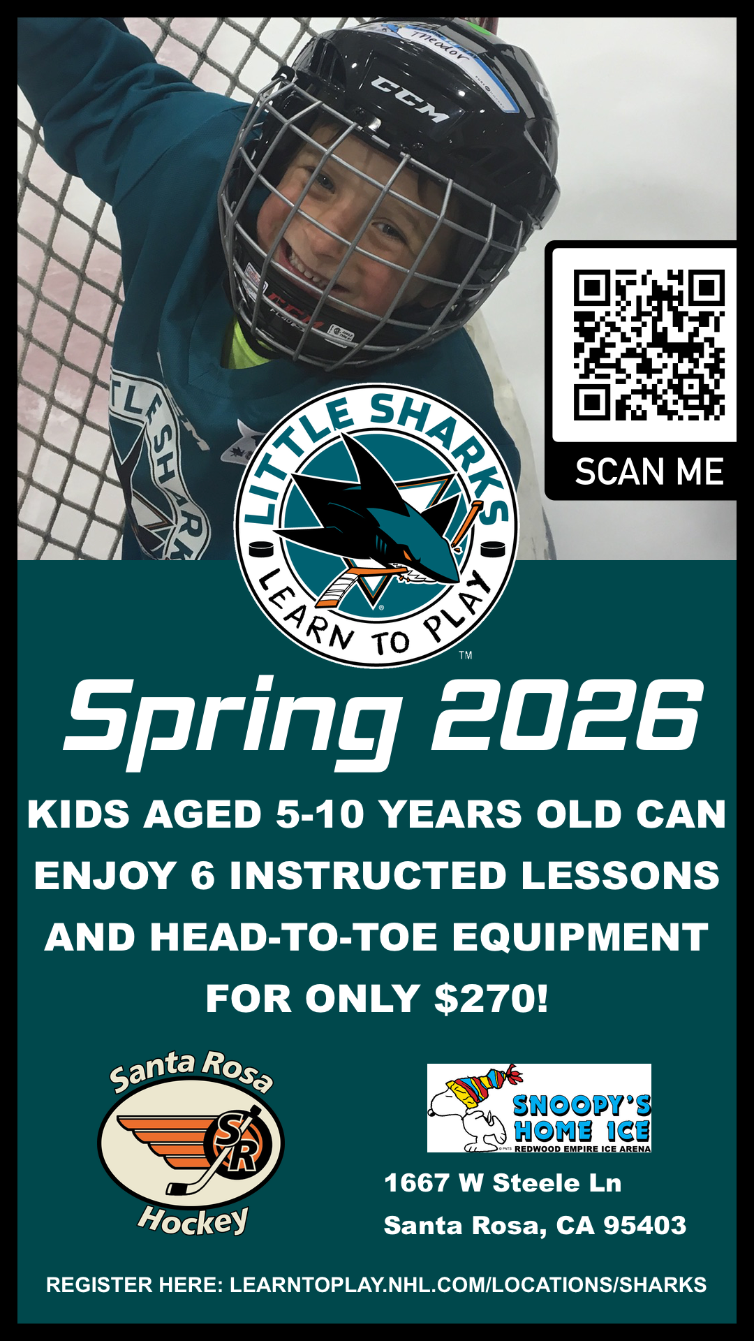 The Santa Rosa Flyers, in collaboration with Snoopy’s Home Ice, are pleased to host the Little Sharks - Learn To Play program in Santa Rosa, April 2026.
